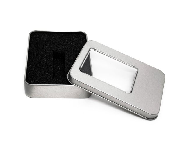 Estojo para pen drive personalizados, confeccionados em alumínio na cor prata. Possui tampa com visor translúcido, e parte interna revestida com espuma. Pode ser personalizado em ambos os lados