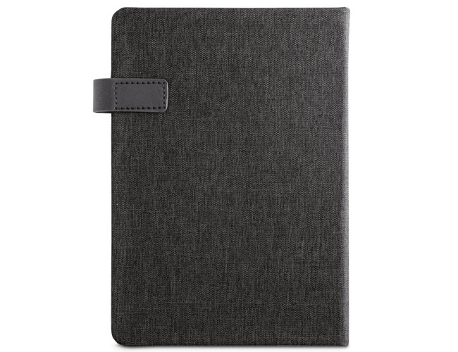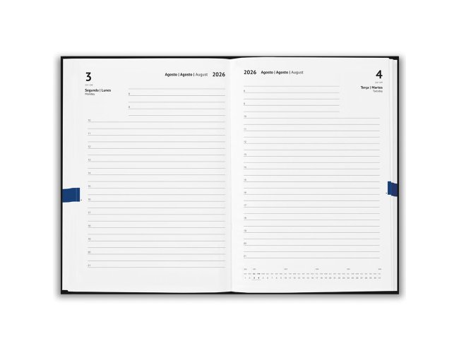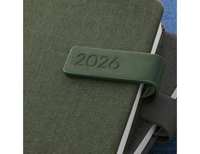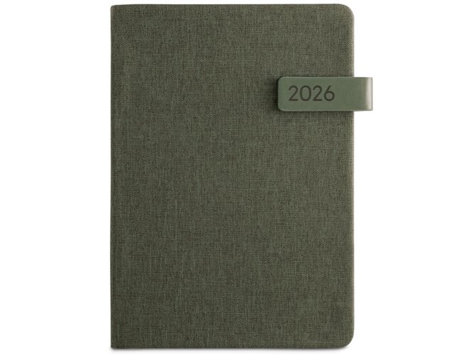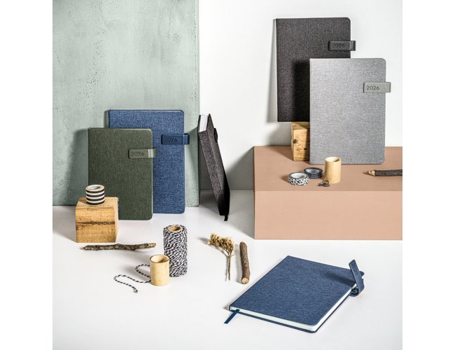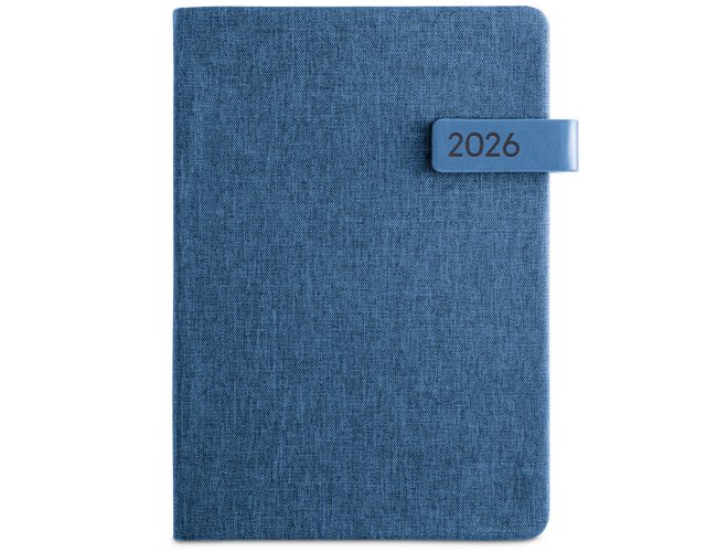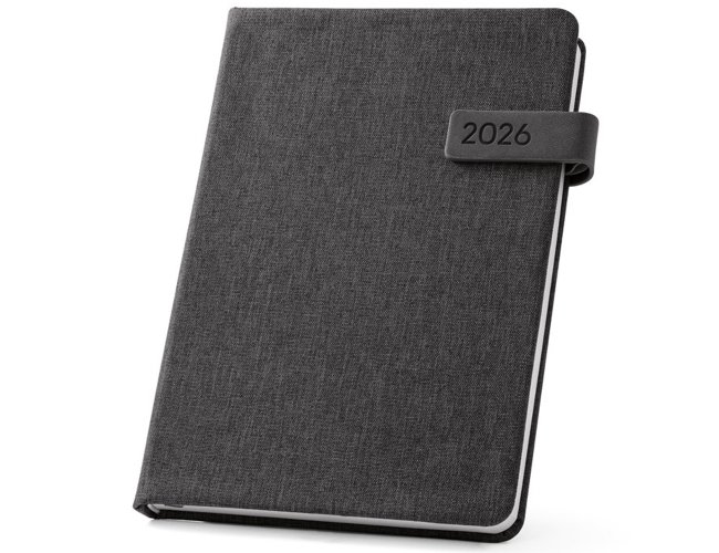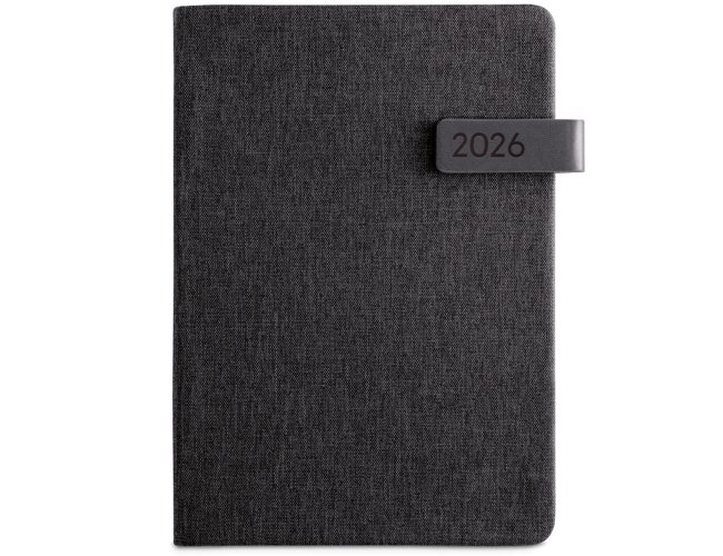 Agenda A5 em PET (100% rPET). Agenda com fecho magnético em PU, marcador em fita e suporte para esferográfica (não inclusa). Está organizada num plano diário. Fornecida com bolsa de non-woven. 148 x 210 mm