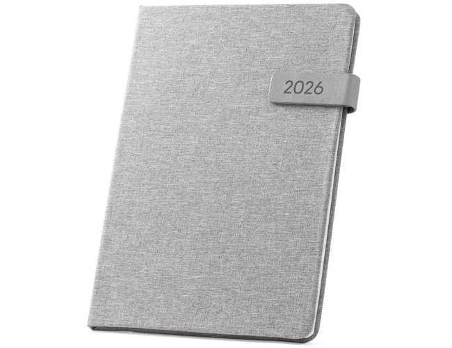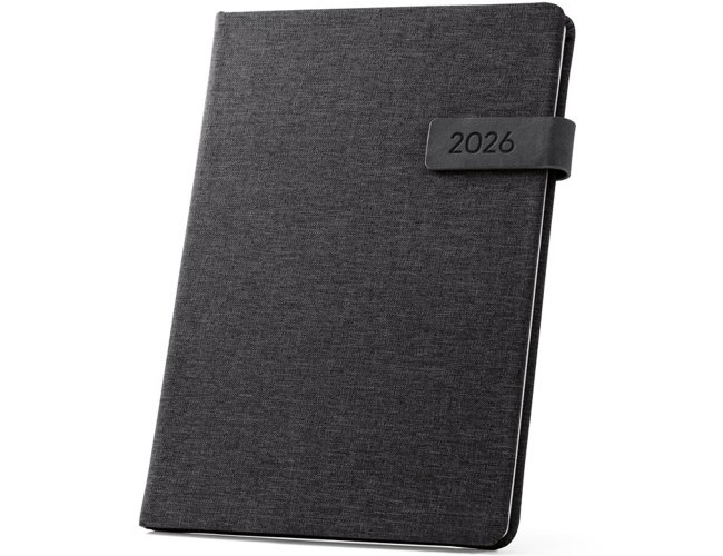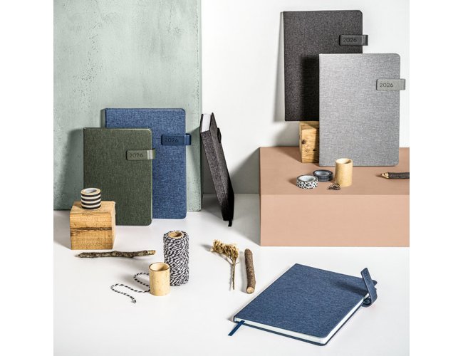 Agenda B5 em PET (100% rPET).Agenda com fecho magnético em PU, marcador em fita e suporte para esferográfica (não inclusa). Está organizada num plano semanal. Fornecida com bolsa de non-woven. 175 x 245 mm