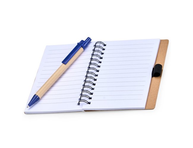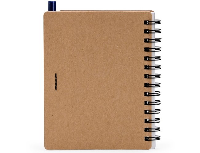 Caderno de capa dura em papelão com detalhe vazado em formato do símbolo da reciclagem, elástico porta-caneta, encadernação Wire-O e cerca de 70 folhas pautadas brancas. Acompanha uma caneta esferográfica de carga azul de 1,0 mm com corpo em papelão e clip, acionamento em clique e ponteira em plástico.