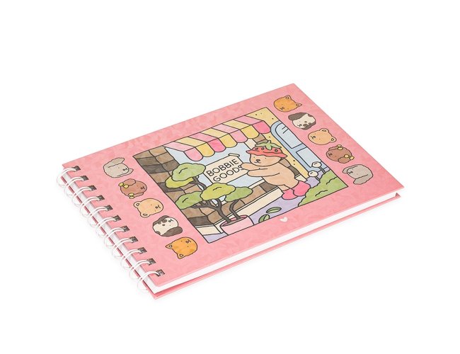 Caderno para colorir personalizado com capa dura e laminação holográfica. Encadernação Wire-O e cerca de 48 folhas com ilustrações de capivaras e outros animais em cenas leves e divertidas. Acompanha folha protetora destacável em acetato.