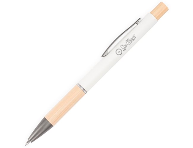 Caneta personalizada XV8187 com corpo metálico e detalhes em bambu, acionamento por clique e carga esferográfica azul 1.0mm. Oferece pegada leve e escrita precisa, unindo sofisticação e sustentabilidade. Brinde elegante e funcional para empresas que valorizam qualidade e design sustentável.