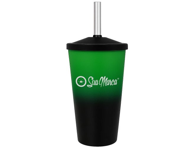 Copo Personalizado de 700ml GV029 com tampa e canudo. Fabricado em polietileno com pintura jateada bicolor, é ideal para eventos corporativos, ações promocionais e brindes personalizados. Prático, resistente e com ampla área para gravação da sua marca.