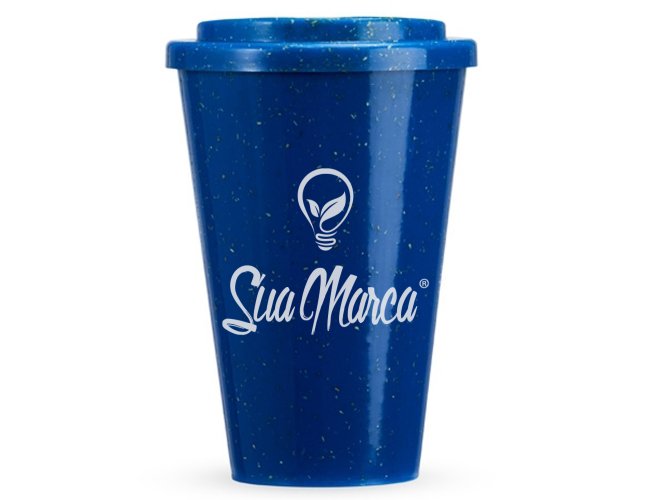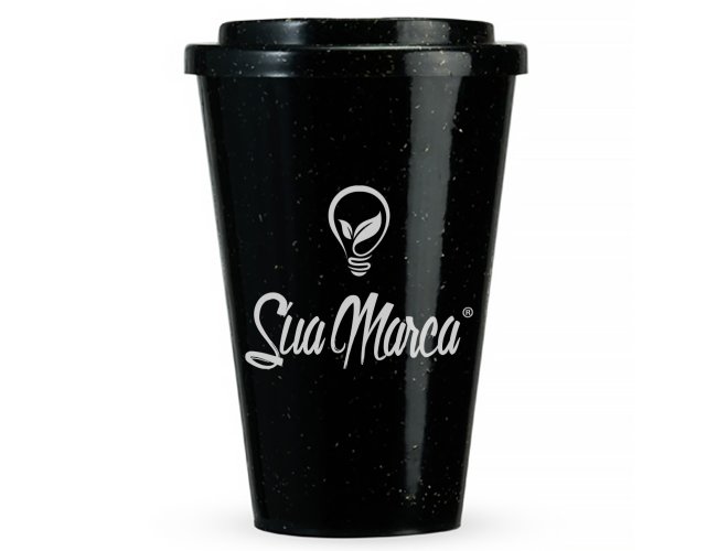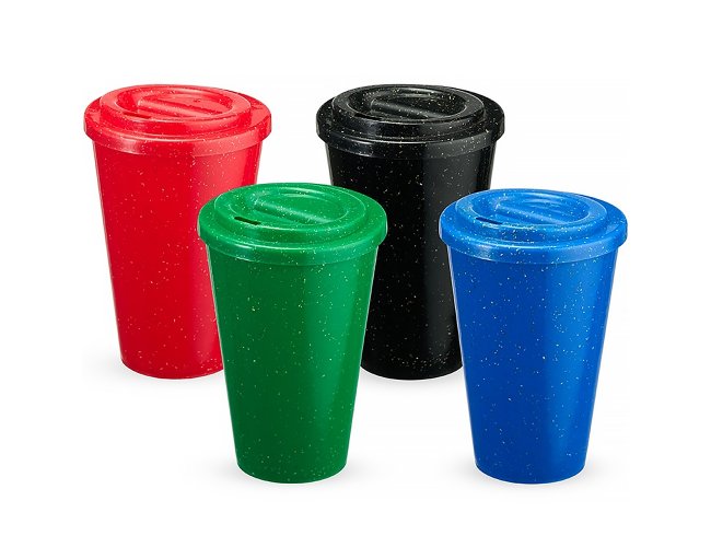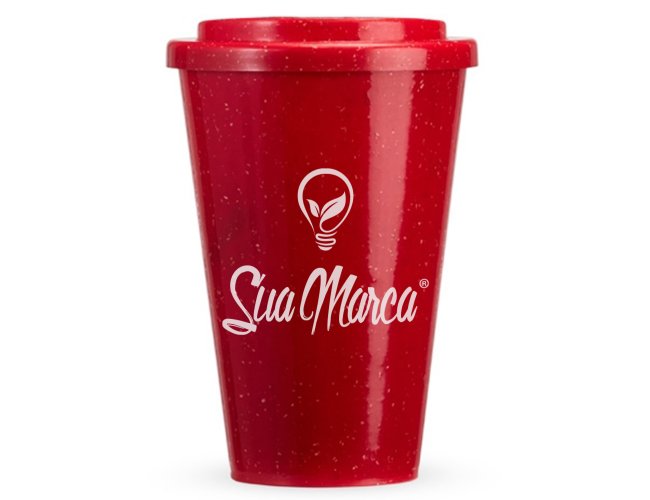 Copo feito em fibra de madeira com capacidade máxima de 450ml. Possui tampa com bocal.