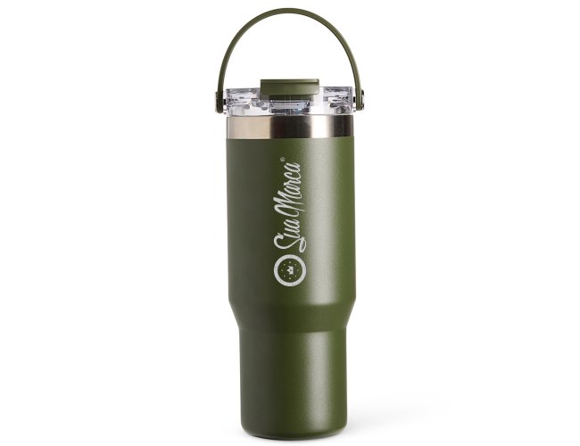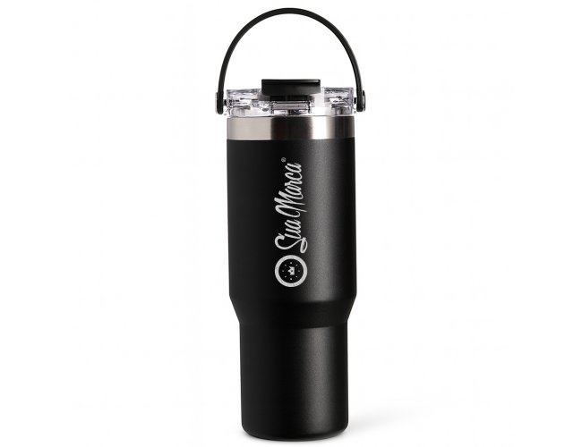 Copo Térmico Personalizado Inox 900 ml XV18969: corpo em aço inox com parede dupla e vedação a vácuo para manter a bebida na temperatura ideal por mais tempo. Vem com tampa plástica rosqueável, tampa adicional com proteção do bocal, bico flip, canudo interno removível e alça para transporte. Pintura eletrostática para cor duradoura e acabamento premium.