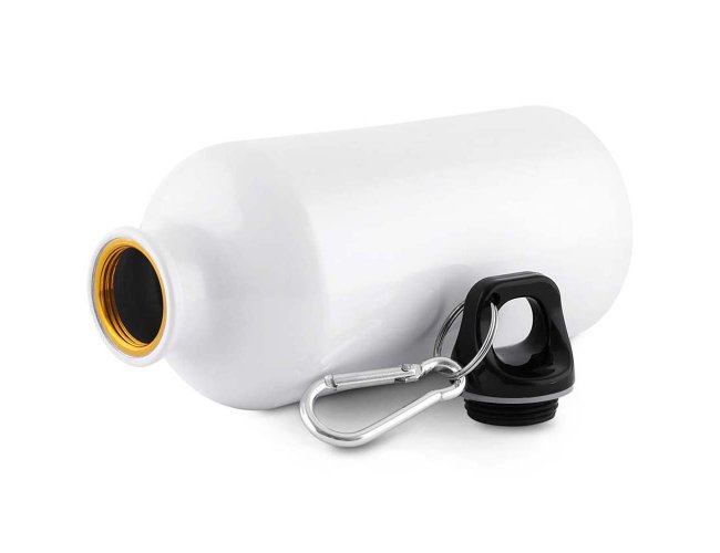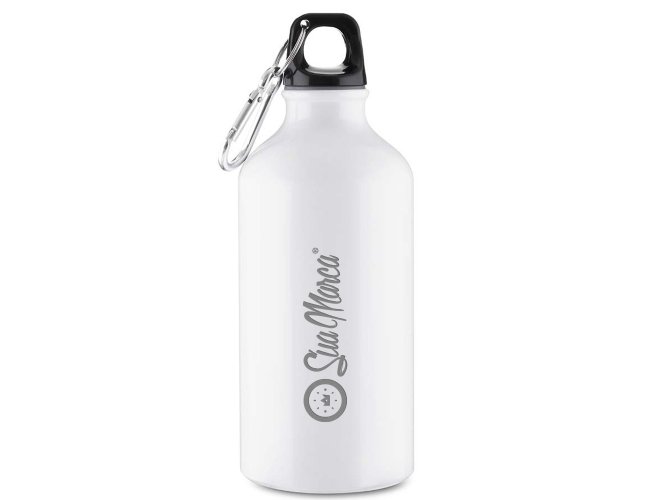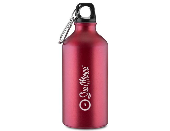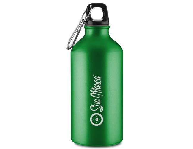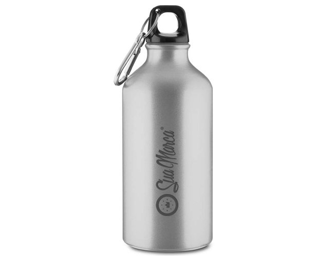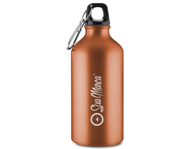 Garrafa Personalizada de Alumínio 550 ml AVGA7850: feita em alumínio reciclado com acabamento fosco (exceto na cor branca), é leve para levar no dia a dia. A tampa rosqueável em plástico evita vazamentos e o mosquetão acoplado facilita prender na mochila ou cinto.
