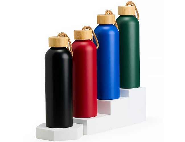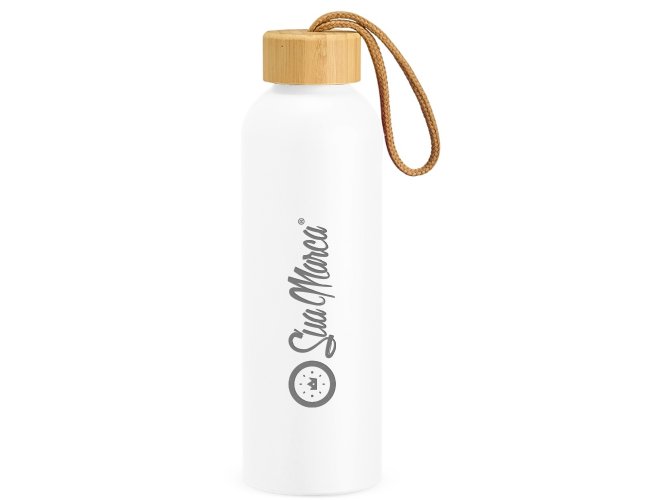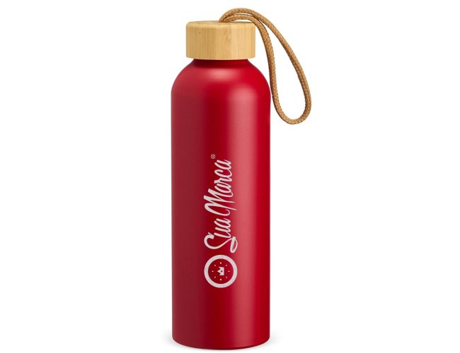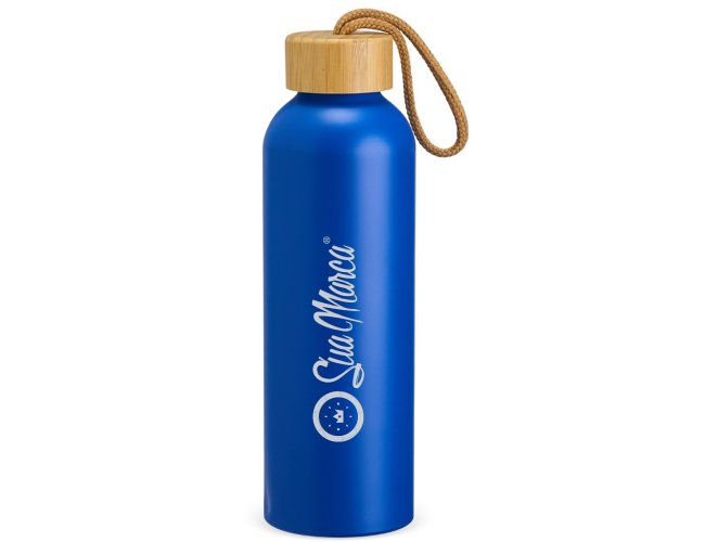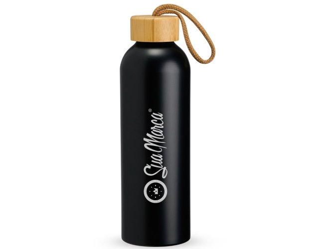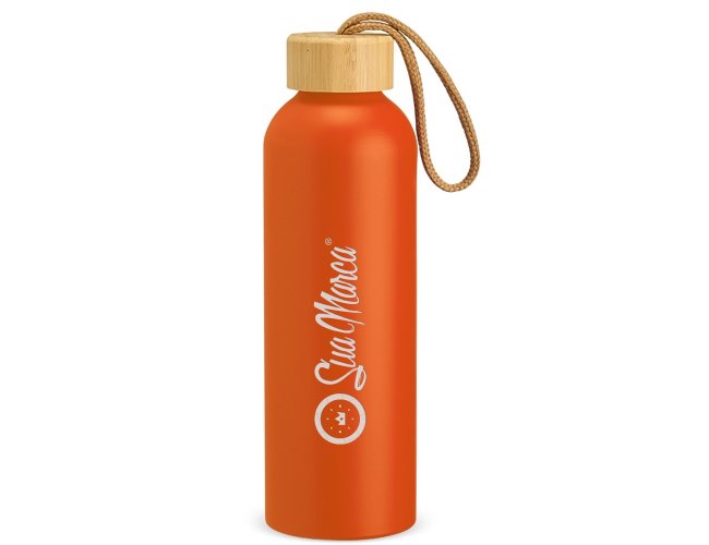 Garrafa Personalizada de Alumínio 800ml XV18940, confeccionada em alumínio com capacidade máxima de 800ml. Possui tampa rosqueável em bambu com alça de algodão para facilitar o transporte. MEDIDA: Altura: 23,5 cm X Largura: 7 cm X Circunferência: 23 cm. Peso aproximado (g): 111