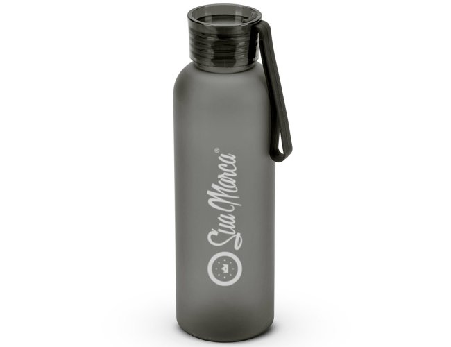 Garrafa Personalizada de PET Eco 600 ml SV54299: feita em PET 100% reciclado com acabamento fosco, é ideal para o dia a dia. A tampa em PS à prova de vazamentos e a fita em silicone facilitam o transporte em treinos, escritório ou passeios.