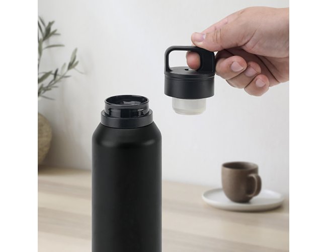 - Qual é a capacidade da garrafa térmica? A capacidade é de 590ml, ideal para uso diário em ambientes corporativos, viagens, academia ou atividades ao ar livre.