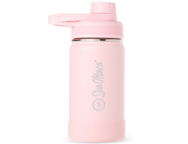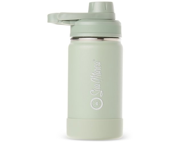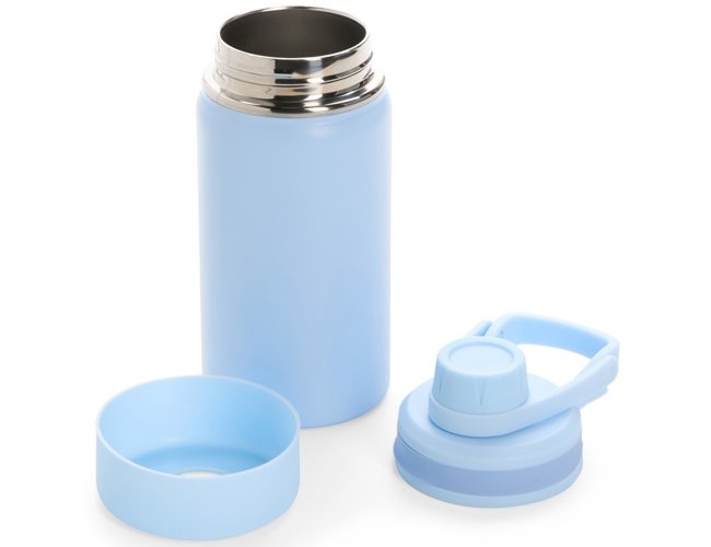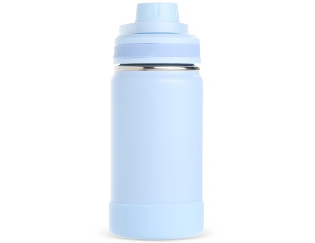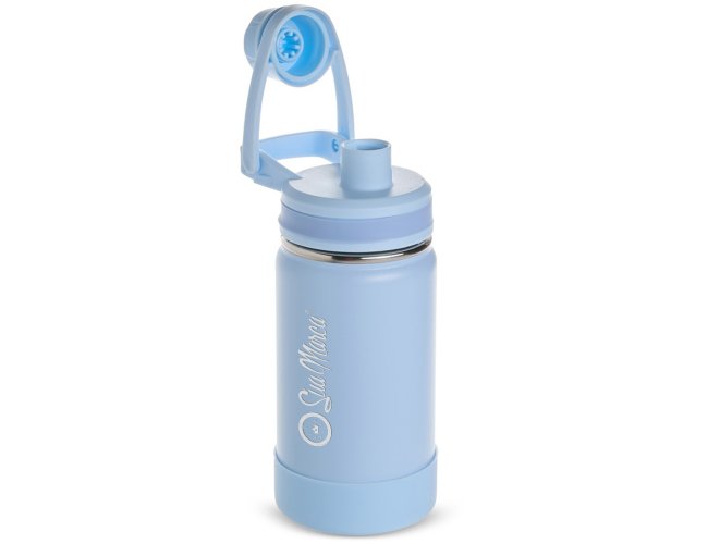 Garrafa térmica personalizada confeccionada em aço inox, pintura eletrostática e capacidade para até 350ml. Conta com estrutura de parede dupla e vedação a vácuo, permitindo conservar a temperatura de líquidos por mais tempo. Possui tampa rosqueável com protetor para o bocal e alça fixa para facilitar o transporte. Acompanha protetor para a base em silicone.