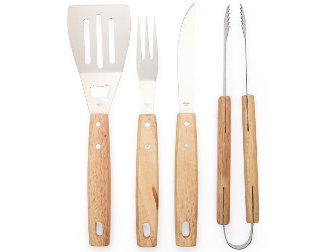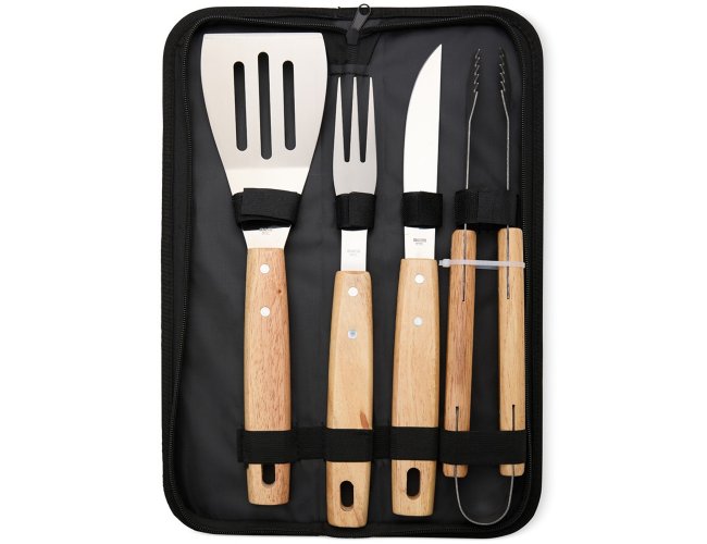 Kit Churrasco Personalizado 4 Peças XV18894: praticidade e performance à mão. Traz espátula, garfo, pegador e faca de 6, todos em aço inox com cabos de madeira. O estojo em nylon facilita guardar e transportar. Um conjunto funcional para assar com eficiência — perfeito para encontros em família ou com amigos.
