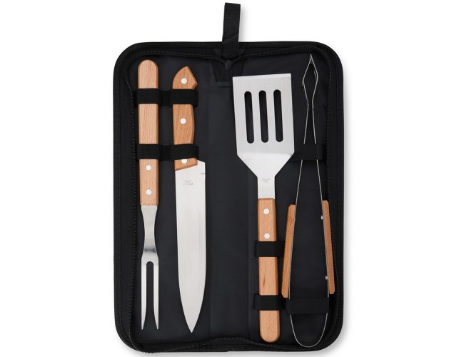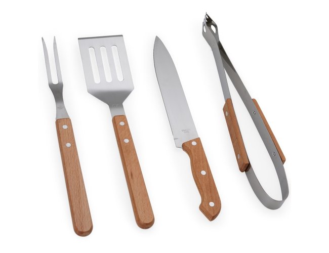 Kit Churrasco Personalizado 4 Peças XV8199: tudo o que você precisa para churrascos práticos e saborosos. Vem com espátula, garfo, pegador e faca de 7, todos em aço inox com cabos de madeira. Acompanha estojo em nylon para guardar e transportar com facilidade.