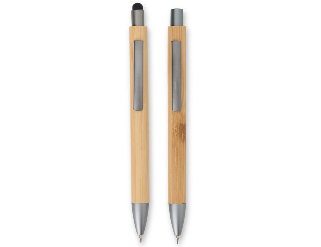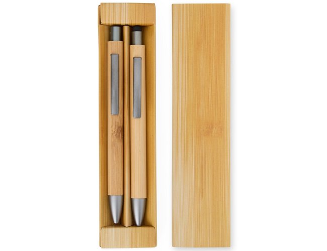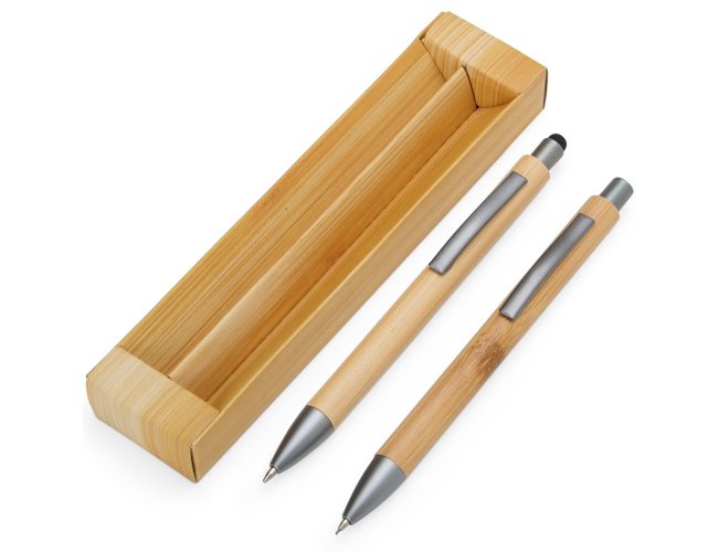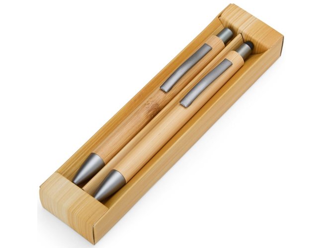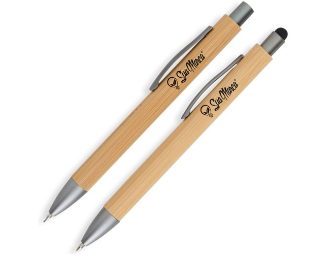 Kit de Caneta e Lapiseira Personalizado Eco XV8251: feito em bambu, une design natural e funcionalidade. A lapiseira tem acionamento por clique para escrita ágil, enquanto a caneta esferográfica azul 1,0 mm oferece traço suave e ponteira touch para uso em telas sensíveis ao toque. Acompanha estojo com efeito bambu, perfeito para presentear.