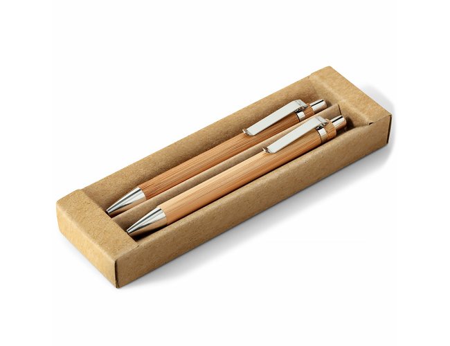 O Kit Personalizado de Caneta e Lapiseira SV51162 une estética natural e praticidade: esferográfica azul de longa duração e lapiseira 0,7 mm para traços precisos. Entregue em estojo de cartão certificado, é uma ótima escolha para kits corporativos com viés ecológico. Observação: materiais naturais podem apresentar variações de tonalidade e gravação.