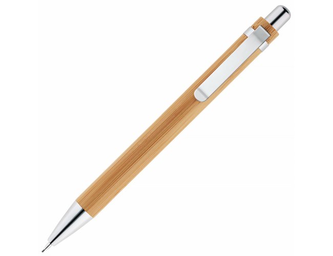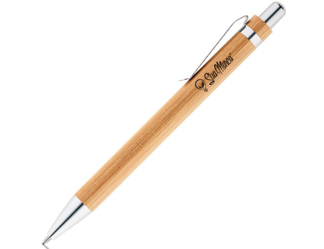 Kit Personalizado de Caneta e Lapiseira SV51162: conjunto em bambu com caneta esferográfica azul (autonomia de até 1,5 km de escrita) e lapiseira 0,7 mm. Acompanha estojo de cartão de gestão florestal sustentável. Por ser material natural, cor e impressão podem variar entre unidades — charme único em cada peça.
