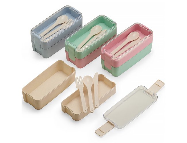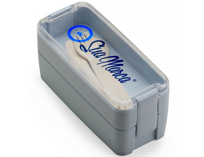 Marmita Personalizada Dupla de Plástico XV18947, confeccionada em plástico polipropileno (PP). Apresenta dois potes com encaixe vertical e capacidade máxima combinada de 750ml. A tampa hermética em poliestireno (PS) possui travas laterais que mantêm ambos os potes unidos. Acompanha garfo, faca e colher em plástico. MEDIDA: Marmita - Altura : 8,5 cm X Largura : 8 cm X Comprimento : 18,5 cm | Garfo (C x L) - 15 cm x 2,5 cm | Colher (C x L) - 15 cm x 3 cm | Faca (C x L) - 15 cm x 2 cm. Peso aproximado (g): 176