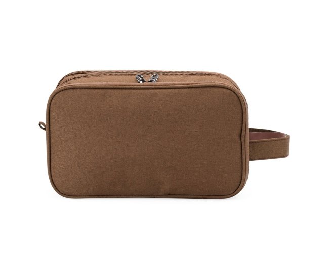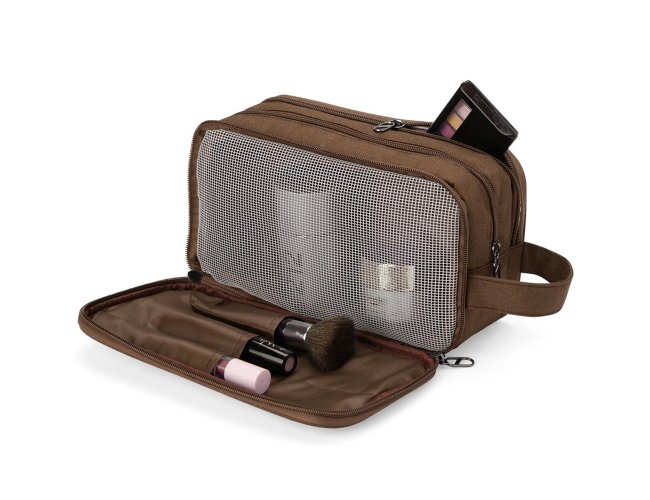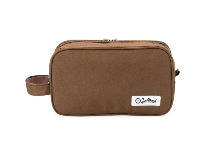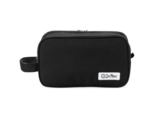 Necessaire Personalizada de Poliéster XV18873: prática, resistente à água e ideal para viagens e rotina. São 3 compartimentos — um com divisórias, outro com dois bolsinhos e o principal amplo com tela — para acomodar de maquiagem e cremes a itens de higiene, escova de dente e até toalha de mão. Compacta, cabe fácil em mochilas e malas, com alça de mão e alça para chaves. Painel emborrachado dedicado à personalização.