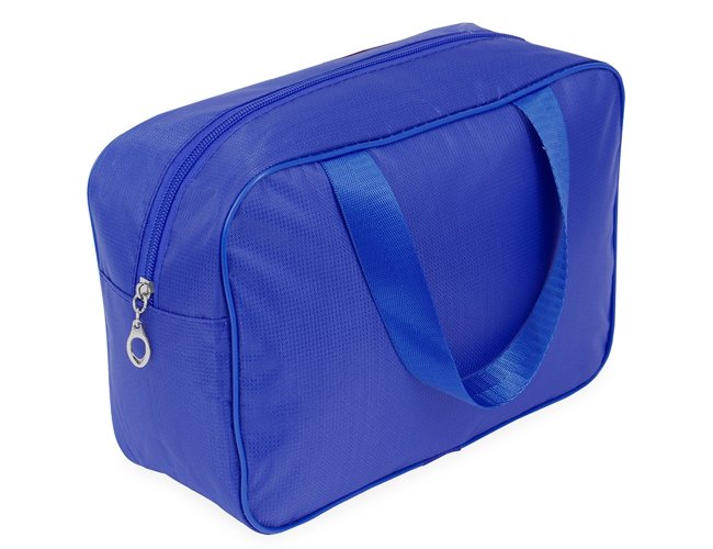 Nécessaire Personalizada de Poliéster XV19067, confeccionada em poliéster impermeável e revestimento interno em PVC. Possui fechamento em zíper e duas alças em nylon. MEDIDA: Altura: 18 cm X Largura: 25 cm X Profundidade: 9,5 cm X Comprimento da alça: 32 cm. Peso aproximado (g): 105