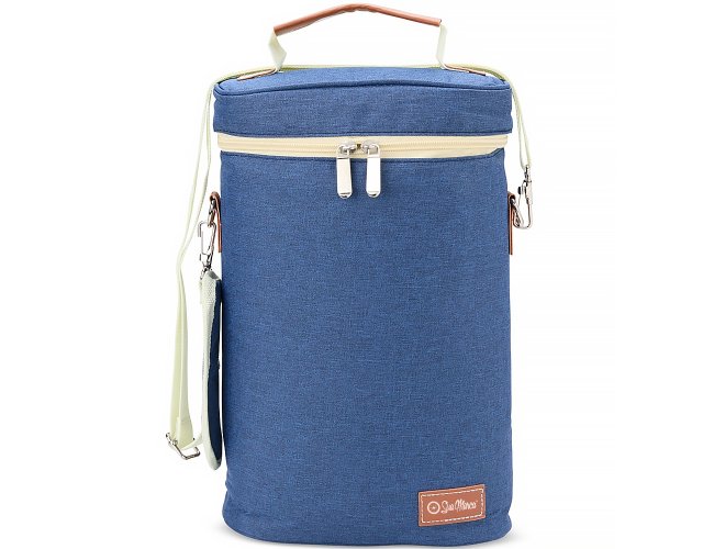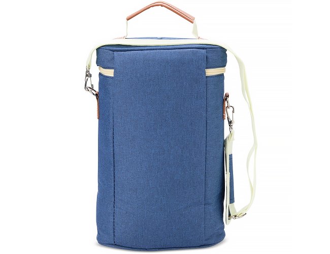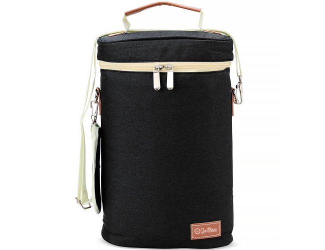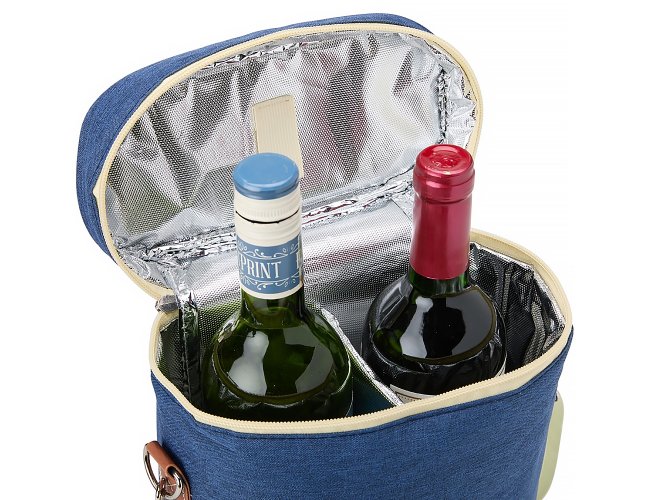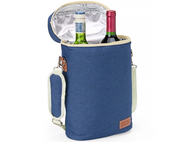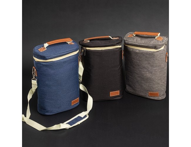Porta Garrafas Térmico Personalizado Duplo XV18865: mantém as bebidas frescas por mais tempo e leva duas garrafas com segurança. Em nylon com detalhes em couro sintético, traz divisória interna, suporte para abridor/acessórios, alça de mão e alça de ombro ajustável e removível. Espaço dedicado para personalização da sua marca.
