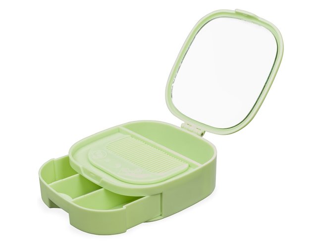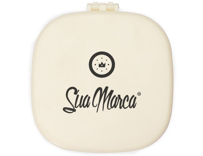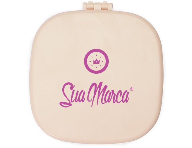 Porta Jóias Personalizado com Espelho XV18984, confeccionado em plástico com espelho sem aumento na parte interna da tampa. Possui compartimentos internos de tamanhos variados e uma gaveta com três divisórias. Acompanha um pente compacto para cabelos. MEDIDA: Altura: 3,5 cm X Largura: 9,9 cm X Comprimento: 9,9 cm. Peso aproximado (g): 133