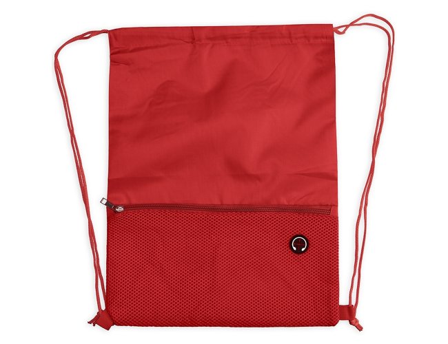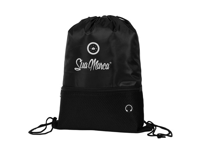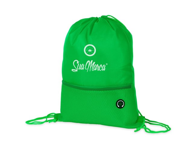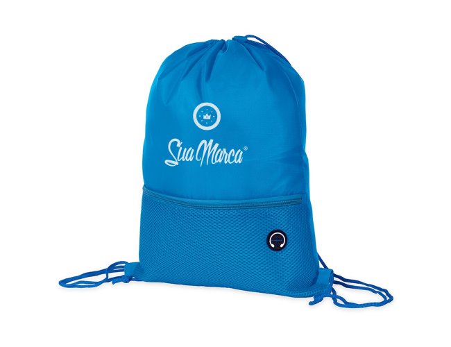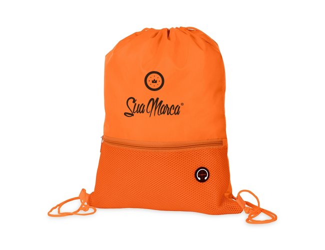 Sacochila Personalizada de Poliéster XV19061, confeccionada em poliéster 420D com bolso externo em malha com entrada para fones de ouvido e alças ajustáveis em nylon. MEDIDA: Altura: 44 cm X Largura: 34 cm. Peso aproximado (g): 63