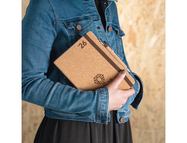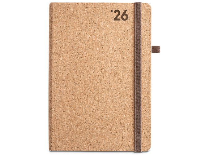 Agenda A5 em cortiça com suporte para esferográfica (não inclusa), miolo em cor marfim e marcador em fita. Está organizada num plano diário. Fornecida em bolsa de non-woven. 148 x 210 mm