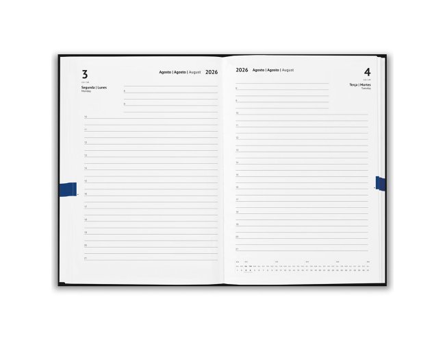 Agenda A5 em cortiça e linho com suporte para esferográfica (não inclusa), marcador em fita e elástico para fecho na mesma cor. Está organizada num plano diário. Fornecida com bolsa de non-woven. 148 x 210 mm